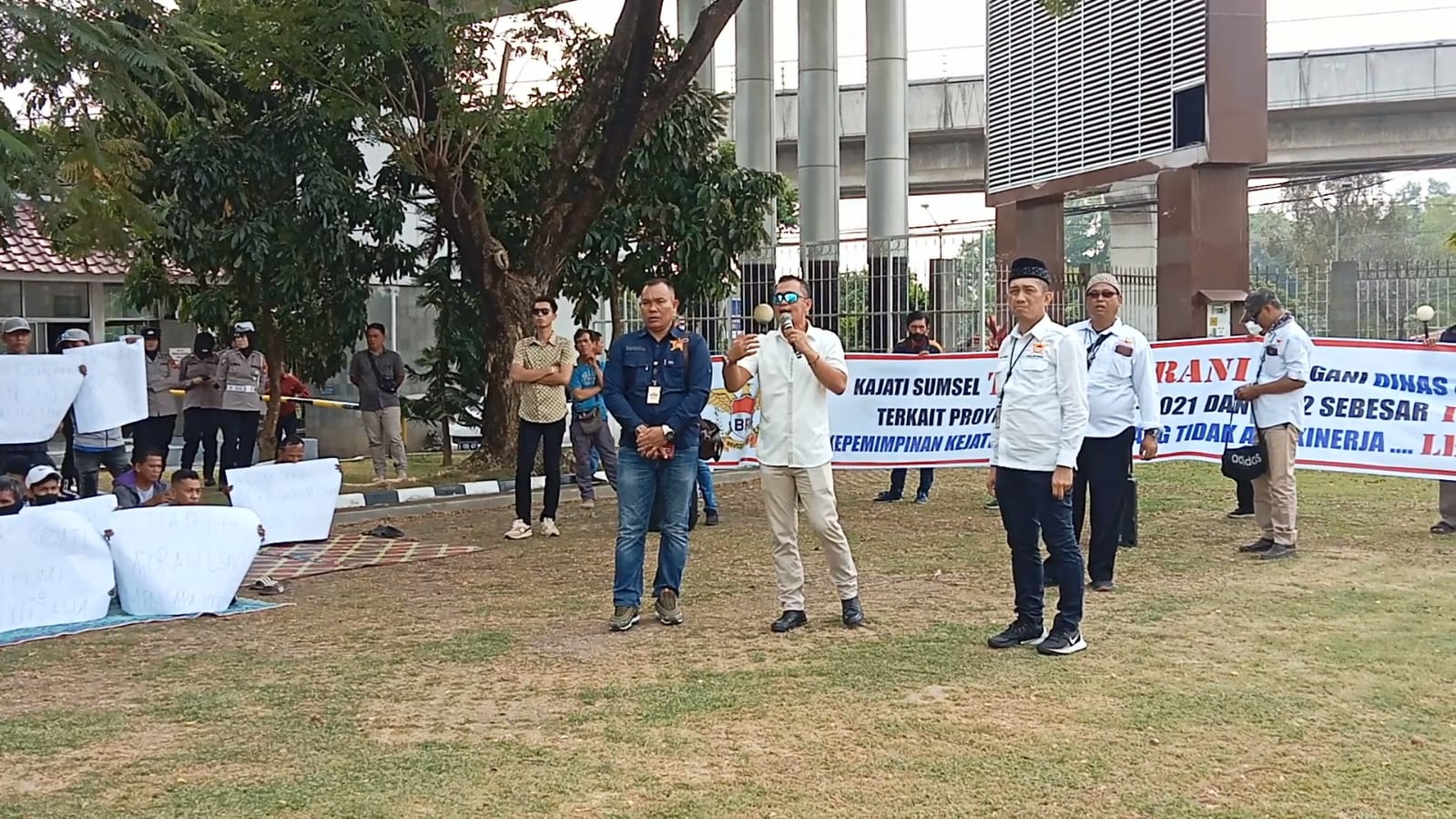 bersama MAKI, SIRA, PST, menggelar aksi damai menyampaikan aspirasi di depan Kantor Kejaksaan Tinggi (Kejati) Sumsel, Senin (5/6/2023).