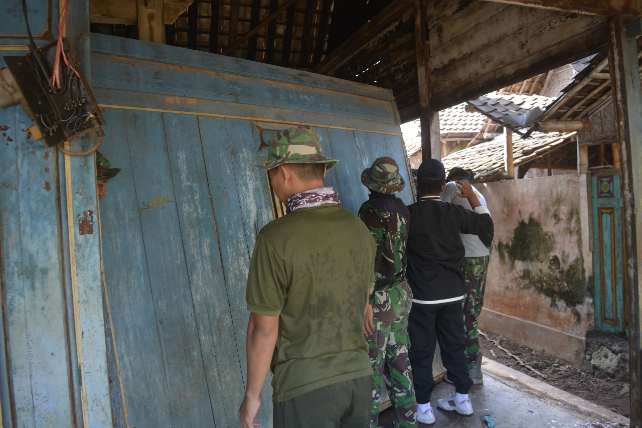 Satgas TMMD 109 Kodim 0812 Lamongan, beserta warga masyarakat bersama sama dalam membongkar rumah panji dalam progran TMMD