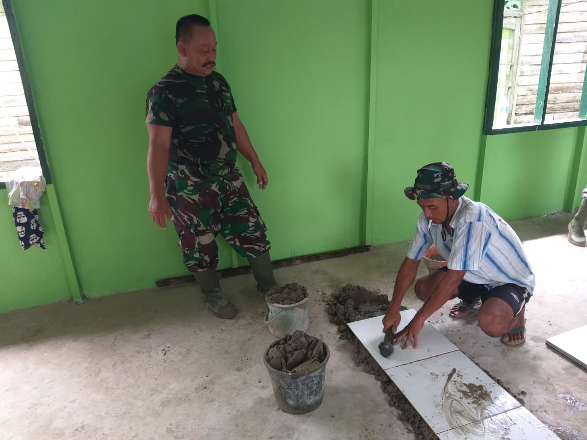 Dan SSK Kapten Inf Handoyo mengatakan para prajurit yang tergabung dalam Satuan Tugas (Satgas) TMMD ke-110 sudah hampir menyelesaikan pemasangan Keramik lantai di Mushola Miftahul Jannah.