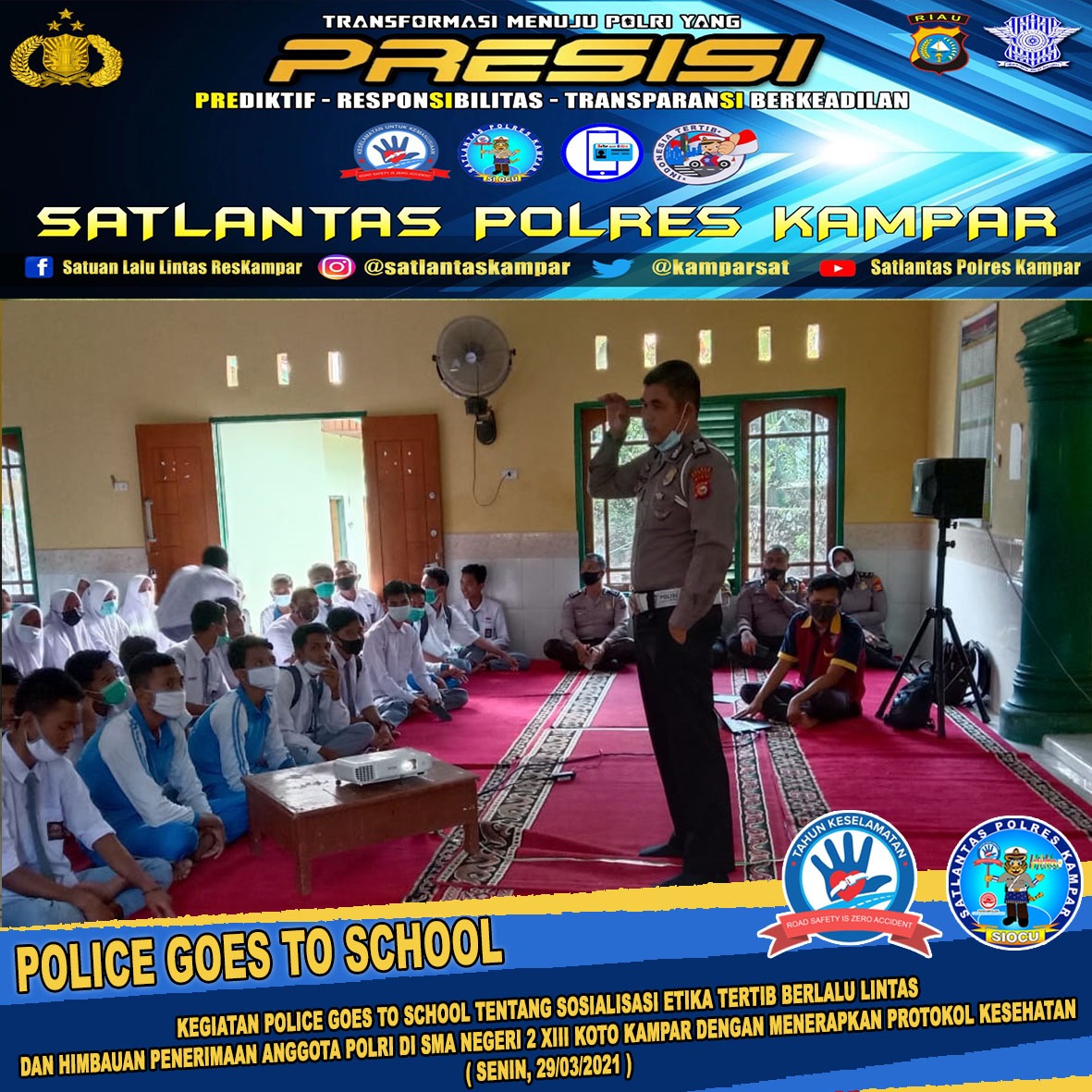 Pada kesempatan ini Para Polantas Polres Kampar memberikan sosialisasi tentang etika tertib berlalulintas, himbauan protokol kesehatan dan sosialisasi tentang Rekrutmen anggota Polri tahun 2021, kepada para pelajar SMA Negeri 2 Kecamatan XIII Koto Kampar.