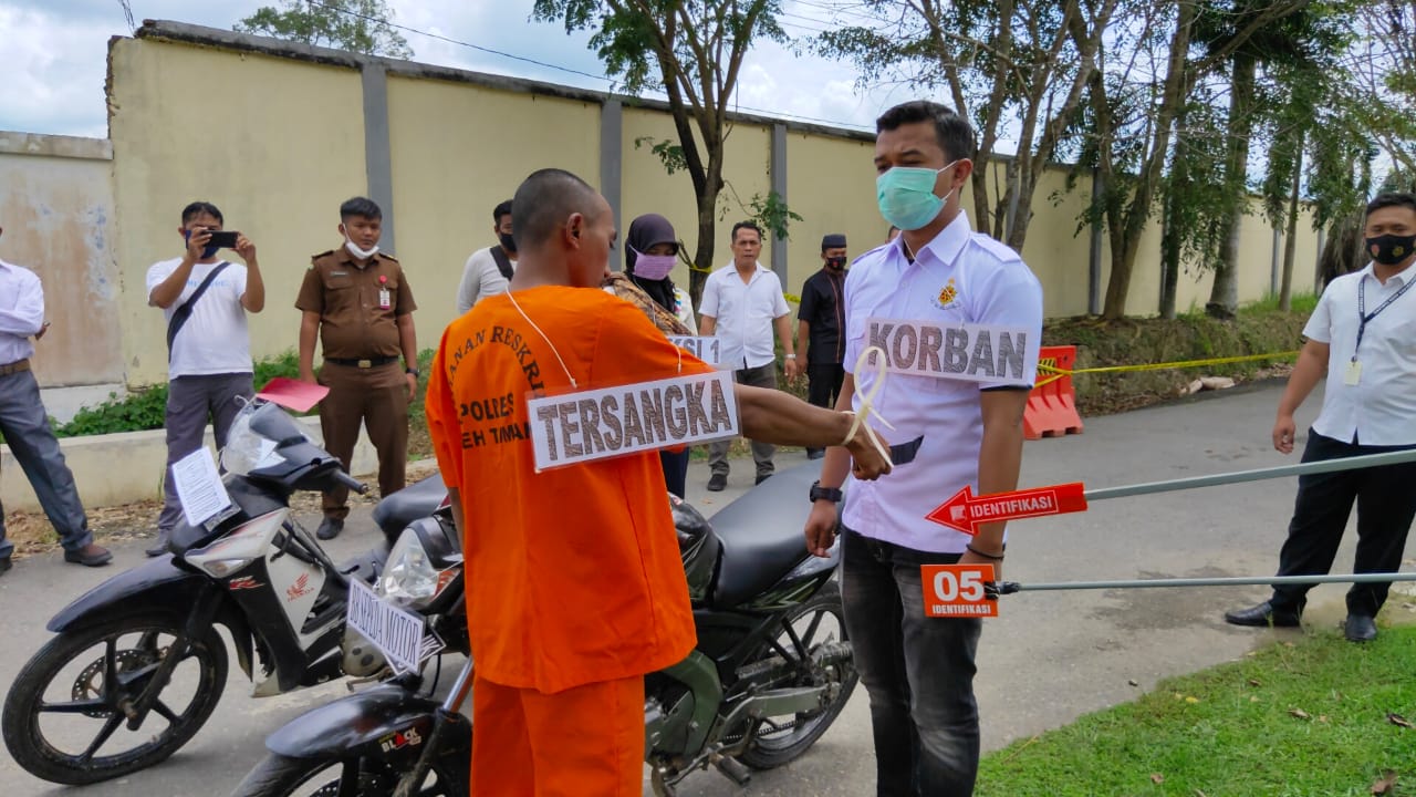 Reka ulang Kasus Pembunuhan Yang Terjadi Di Desa Kenangkung Kecamatan Seruway Aceh Tamiang, yang diadakan Oleh Satreskrim, Bertempat Di Halaman Belakang Polres Aceh Tamiang pada pukul 10:30 wib. Rabu,(04/11/2020).