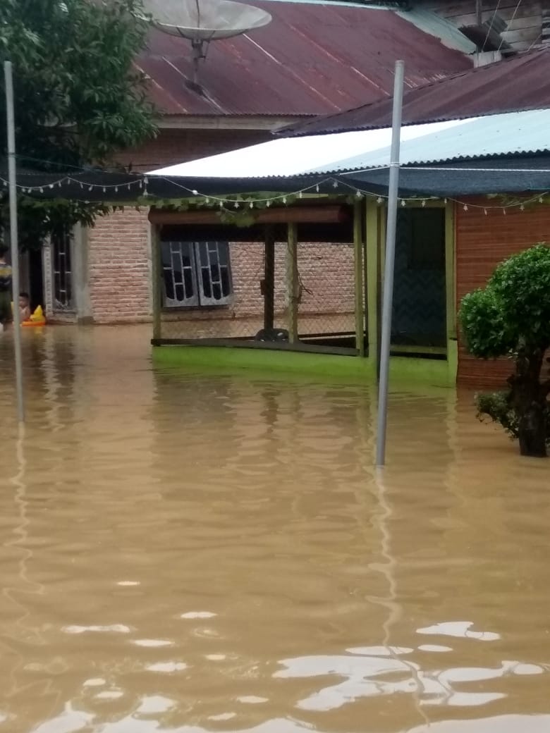 tingginya curah hujan di bagian hulu kabupaten aceh tamiang Mengakibatkan ratusan rumah warga di beberapa kecamatan terendam banjir Sehingga MenjadiTerhenti aktivitas warga.