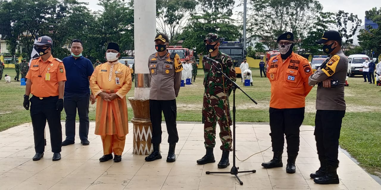 Sekda Kampar Didampingi Kapolres dan Kasdim Pimpin Apel Gabungan Penyemprotan Desinfektan
