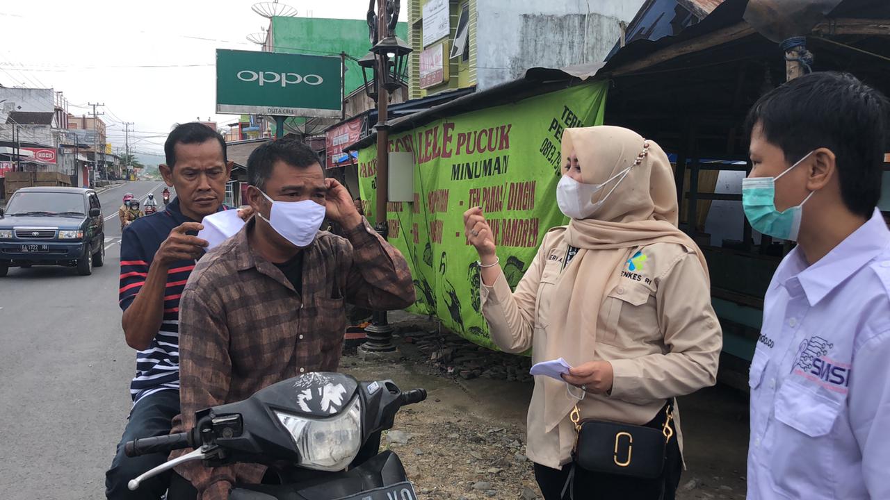 Kepala Dinas Kesehatan OKU Selatan dr., Meri Astuti dan tim Satgas Covid-19 pun ikut serta turun ke jalan membagikan masker kepada para warga yang melintas.
