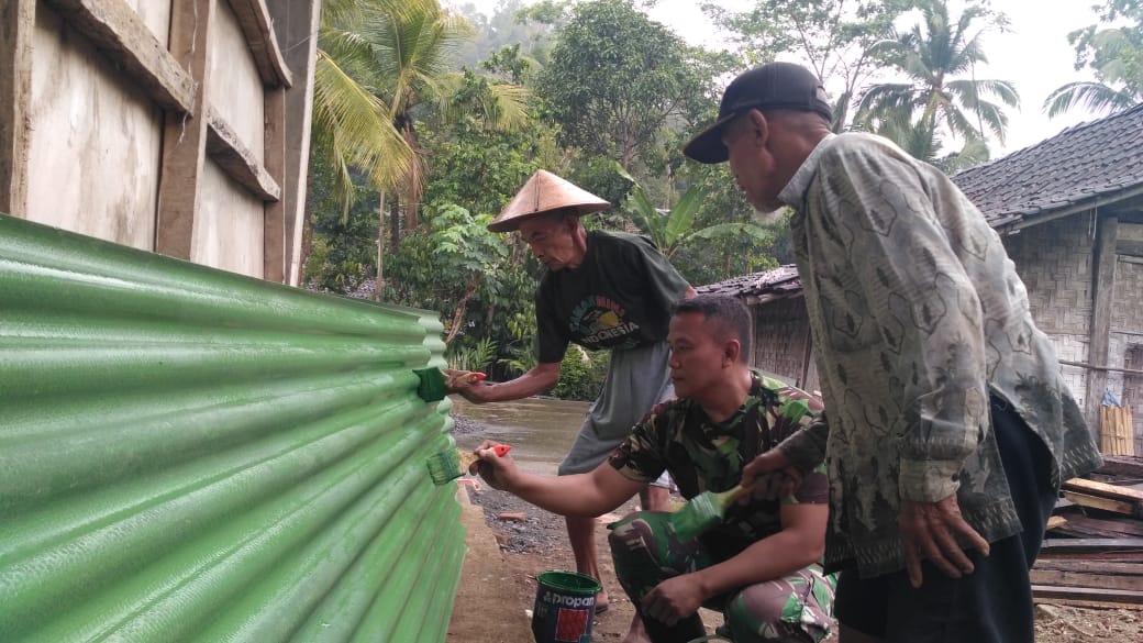 Purworejo —  Semangat Kemanunggalan TNI-Rakyat nampak jelas pada kegiatan TMMD Reguler ke-109 Kodim 0708/Purworejo. Warga masyarakat setempat dengan kesadaran yang tinggi membantu personel TNI menyelesaikan pemasangan atap tempat wudhu dan MCK Masjid Tiban dengan mengebut pengecatan asbes, Selasa (06/10/2020).