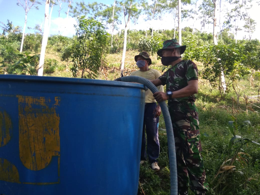 Seperti yang dilakukan oleh Serda Deni, anggota Kodim 0807/Tulungagung ini, ia bersama warga mengisi air bersih ke dalam bak untuk sebagai campuran adonan semen bahan pembuat bangunan.