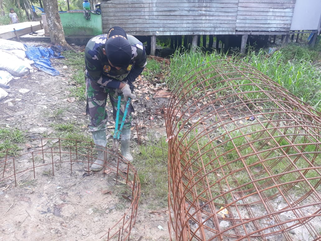 Hal itu terlihat saat Serda Seno, salah satu anggota Satgas TMMD Reguler Ke-110 Kodim 1011/KLK sedang mempersiapkan besi anyaman yang akan dipergunakan dalam proses pengecoran jalan yang akan menjadi penghubung antara Desa dan lahan pertanian.