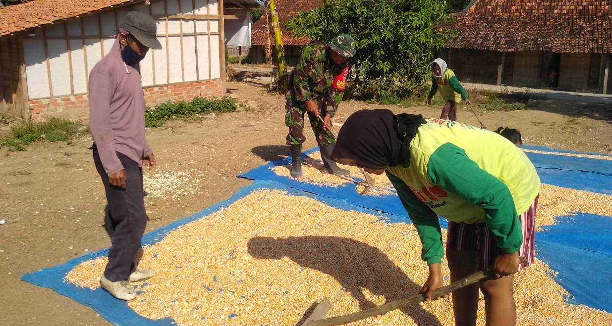 Hal itu benar-benar ditunjukan oleh Babinsa Suparman, yang menjelang pembukaan TMMD harus kalang kabut mempersiapkan banyak hal. Di sela-sela kesibukannya itu, melihat ada warga yang sedang panen jagung, ia langsung menghampiri dan bantu menjemur jagung.