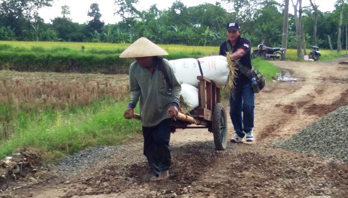 Siang itu,   dengan tertatih Mbah Suji menarik gerobak yang bermuatan gabah hasil panennya dari sawah. Pasalnya, jalanan yang dilalui gerobak yang ditariknya sangat jelek.