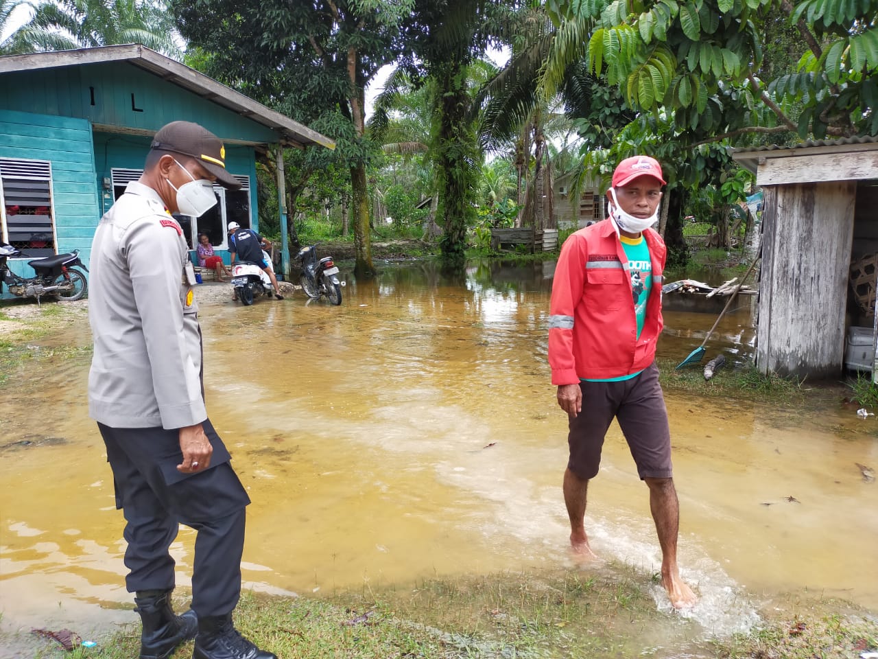 PELALALAWAN, NEWSHANTER.COM Kapolsek Ukui AKP Rifendi S.Sos.,M.Si bersama Anggota dan Kepala Desa Lubuk Kembang Bunga IR.H Rusi Chairus Slamet melakukan Pengecekan bencana alam banjir di Desa Lubuk Kembang Bunga, Kecamatan Ukui Kabupaten Pelalawan, Rabu (11/11/2020).
