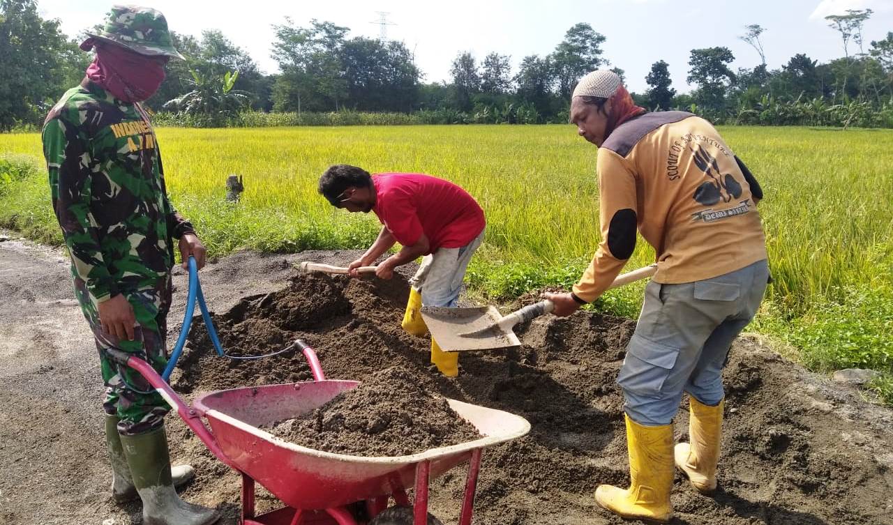 Sementara itu, TNI anggota Satgas TMMD ini, Prada Rahman yang dari Batalyon Infanteri 407/Padma Kusuma, yang terus memainkan angkong, alat bantu untuk melangsir material dalam rangka mendukung penyelesaian pembangunan talud yang ada di Dukuh Jlubang tersebut.