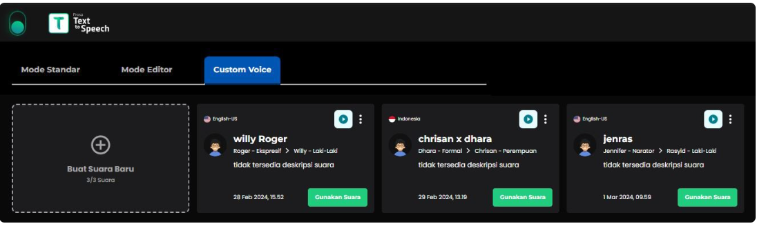 Tampilan Fitur Custom Voice dari Prosa Text to Speech