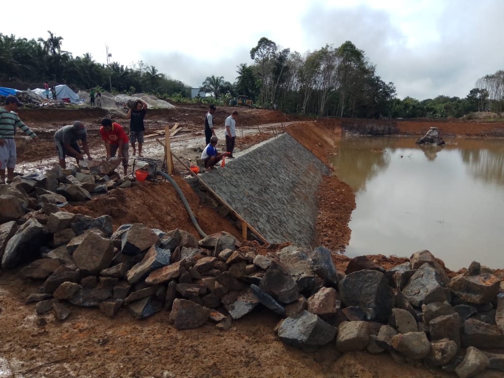 SUKAMARA, Newshanter.com- Proses pembuatan Siring batu embung, TMMD 108 Kodim 1014/Pbn tidak terlepas dari mesin penyedot air portable, karena air galian menimbulkan mata air.