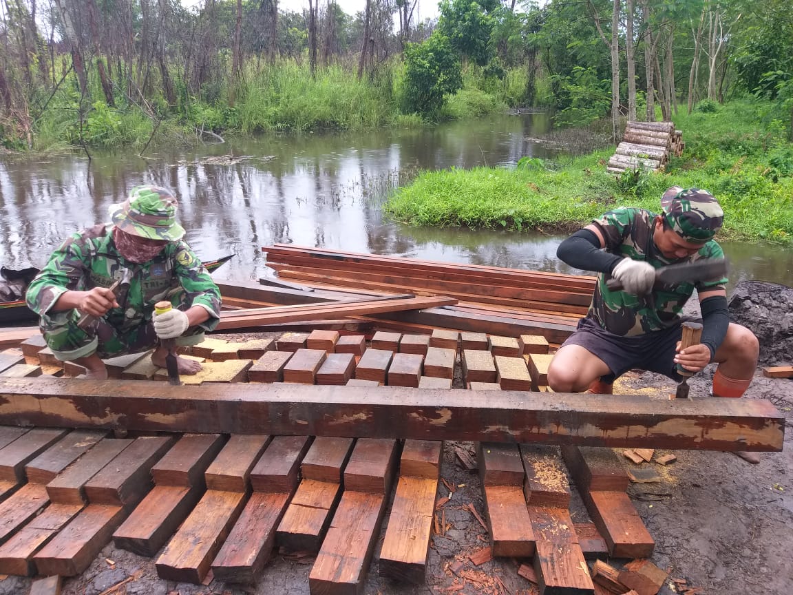 Kapuas, Layaknya seorang tukang kayu yang berpengalaman Satgas TMMD dari Kodim 1011/KLK Kapuas, terus mengerjakan kayu kayu yang tergeletak karena disiapkan mau dikerjakan untuk tiang pancang jembatan Handil Sekumpul.