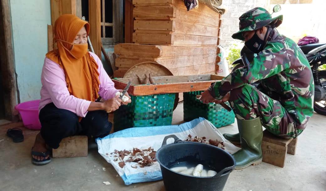Itu terlihat saat Prada Riski dari satuan Yonif Raider 408/Sbh, memanfaatkan kesempatan untuk membantu Ibu Suminem (54) warga Dusun Pucangsari, Desa Jatiwarno untuk mengupas singkong yang akan dipergunakan membuat kerajinan kerupuk.