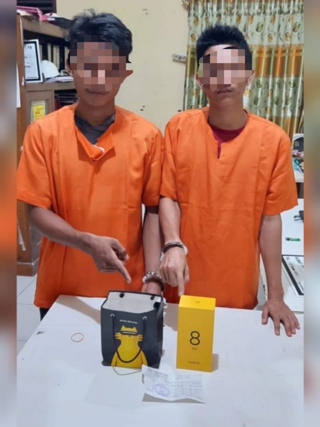 Dari Penangkatpan Pelaku barang bukti yang juga di aman polisi ialah 1 helai baju kaos warna biru milik Pelaku saat mencuri dan 1 buah kotak Hp merk Realme 8 Pro serta 1 buah Bon Faktur pembelian 1 unit Hp merk Realme 8 Pro yang di sita dari pelapor guna untuk melakukan peyelidikan.
