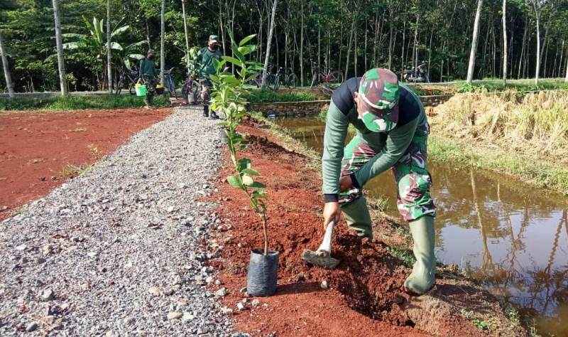 Tampak sejumlah anggota Satgas TMMD, mulai menanam bibit sengon, nangka, jambu, rambutan, dan jeruk, di lingkungan Lapangan Desa Pantirejo, di Dukuh Sutosari, di sela-sela kesibukan mengejar target penyelesaian sejumlah sasaran fisik TMMD menjelang penutupan program (14/4). Rabu (8/4/2020).