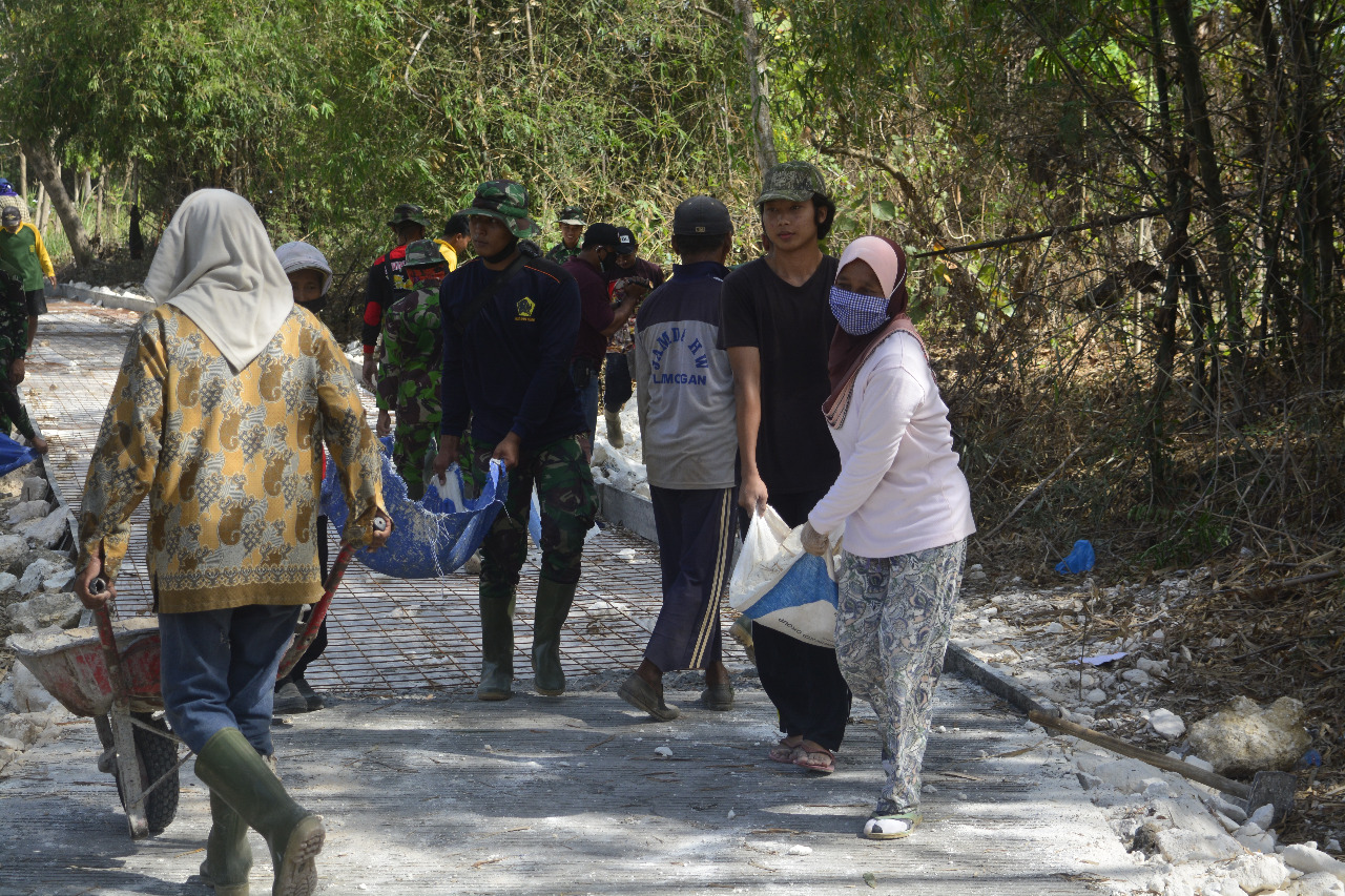 Lamongan,- Program TNI Manunggal Membangun Desa (TMMD) 109 Kodim 0812/Lamongan yang saat ini sudah memasuki hari ke 8 sejak dibukanya, para anggota Satgas TMMD bersama dengan warga Desa Tebluru, Kecamatan Solokuro Kabupaten Lamongan masih terus berjibaku melaksanakan pengerjaan Rabat Beton sejauh 900 Meter dengan lebar 3 meter di Desa Tebluru.