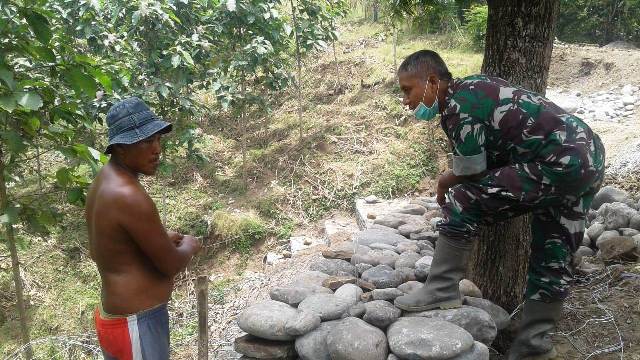 Dia selalu bekerjasama dan saling membantu dengan anggota Satgas TMMD yang ditugasi mengerjakan bronjong. (rel)